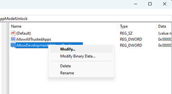STEP 4f: Name the new DWORD (32-bit) Value: AllowDevelopmentWithoutDevLicense, click Enter NOTE: If this key already exists, move to the next step