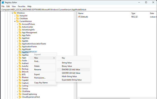 STEP 4e: Right click on AppModelUnlock folder and select New -> DWORD (32-Bit) Value