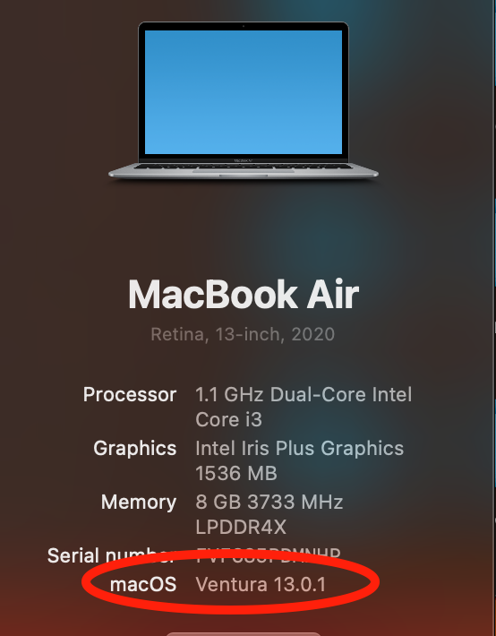 Step 3b: Look next to macOS for: Example: Ventura 13.0.1 (image is from an Intel based Mac, screen will look similar with an M processor)