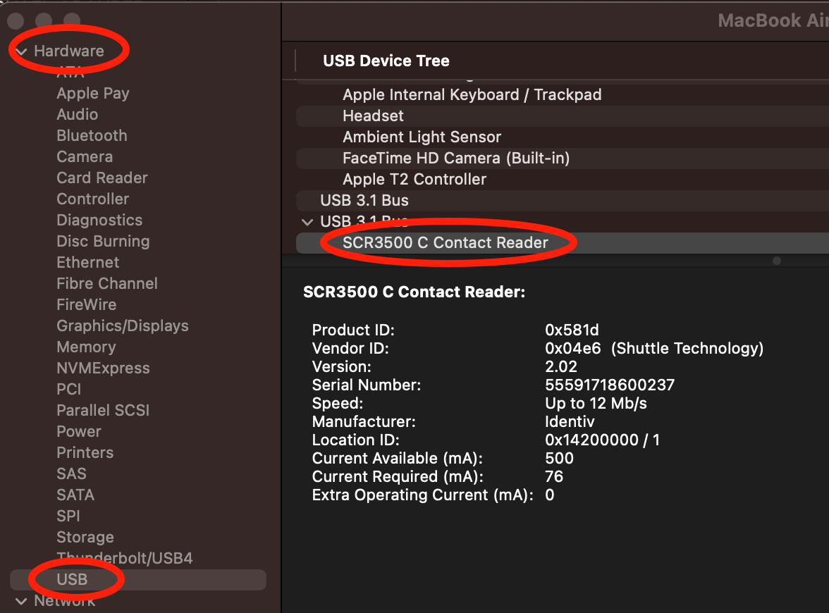 Step 2c: Verify the CAC reader shows in Hardware, USB, under USB Device Tree. Different readers will show differently, most readers have no problem in this step.