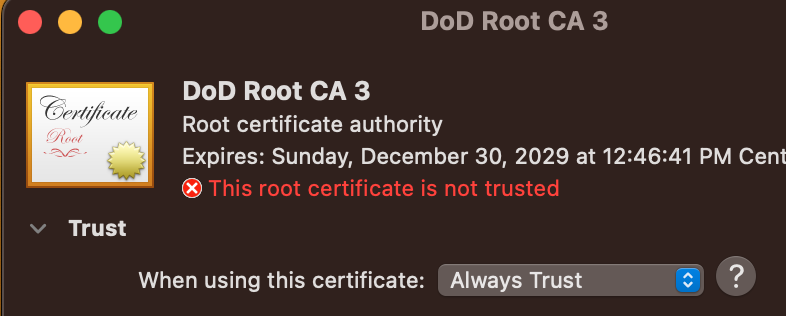 You need to manually trust the DoD Root CA 3, 4, 5, & 6 certificates Double click each of the DoD Root CA certificates, select the triangle next to Trust, in the When using this certificate: select Always Trust, repeat until all 3 do not have the red circle with a white X.